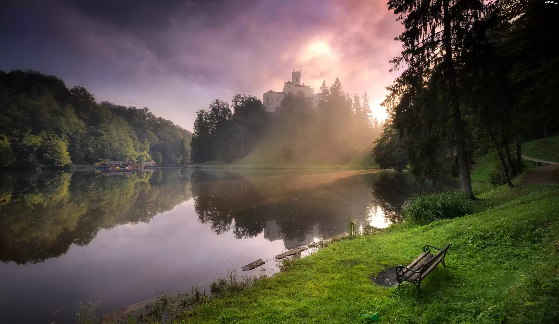 Jezioro, Chorwacja, Ławka, Drzewa, Przebijające światło