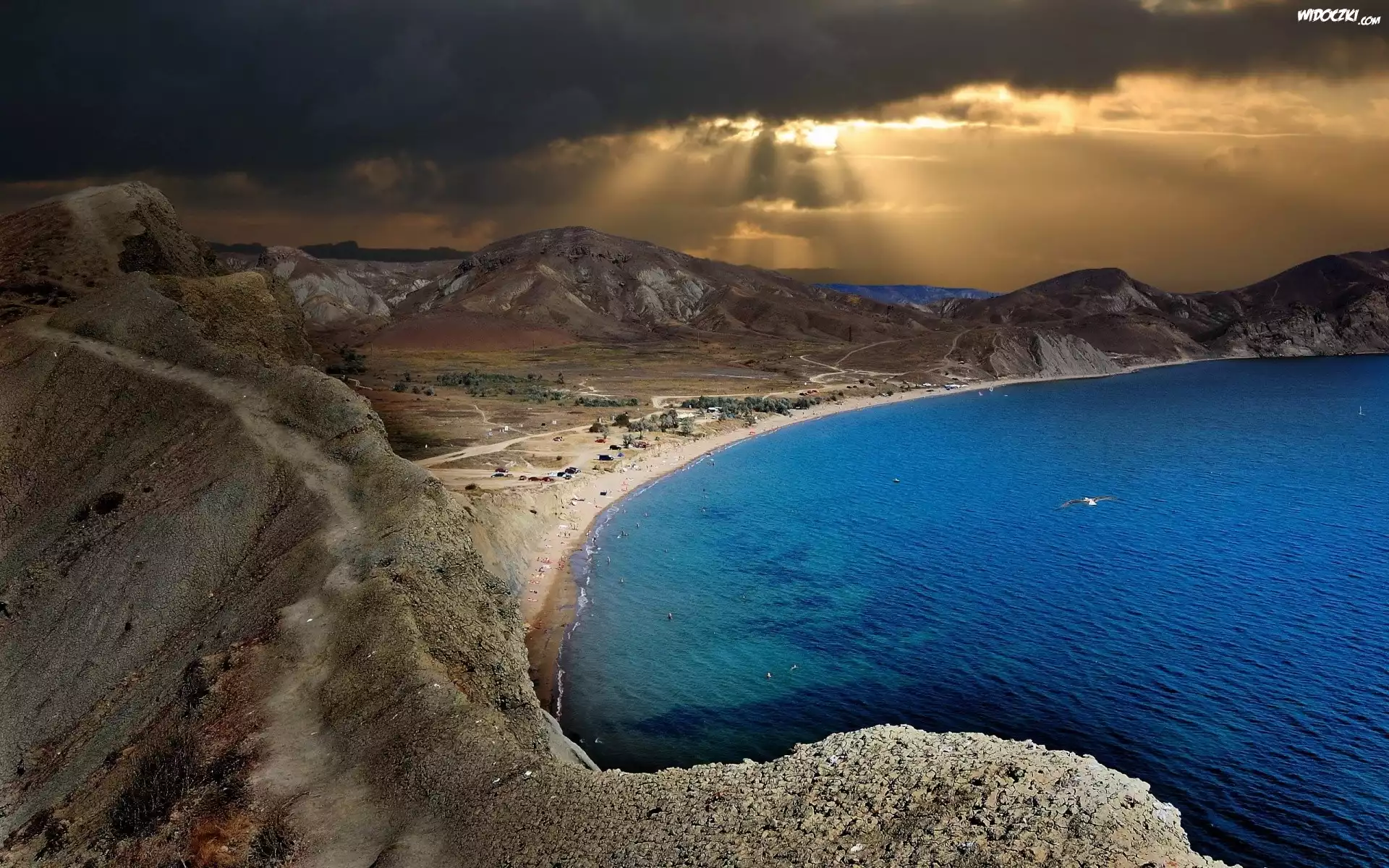 Jezioro, Wzgórza, Chmury, Prześwitujące, Słońce
