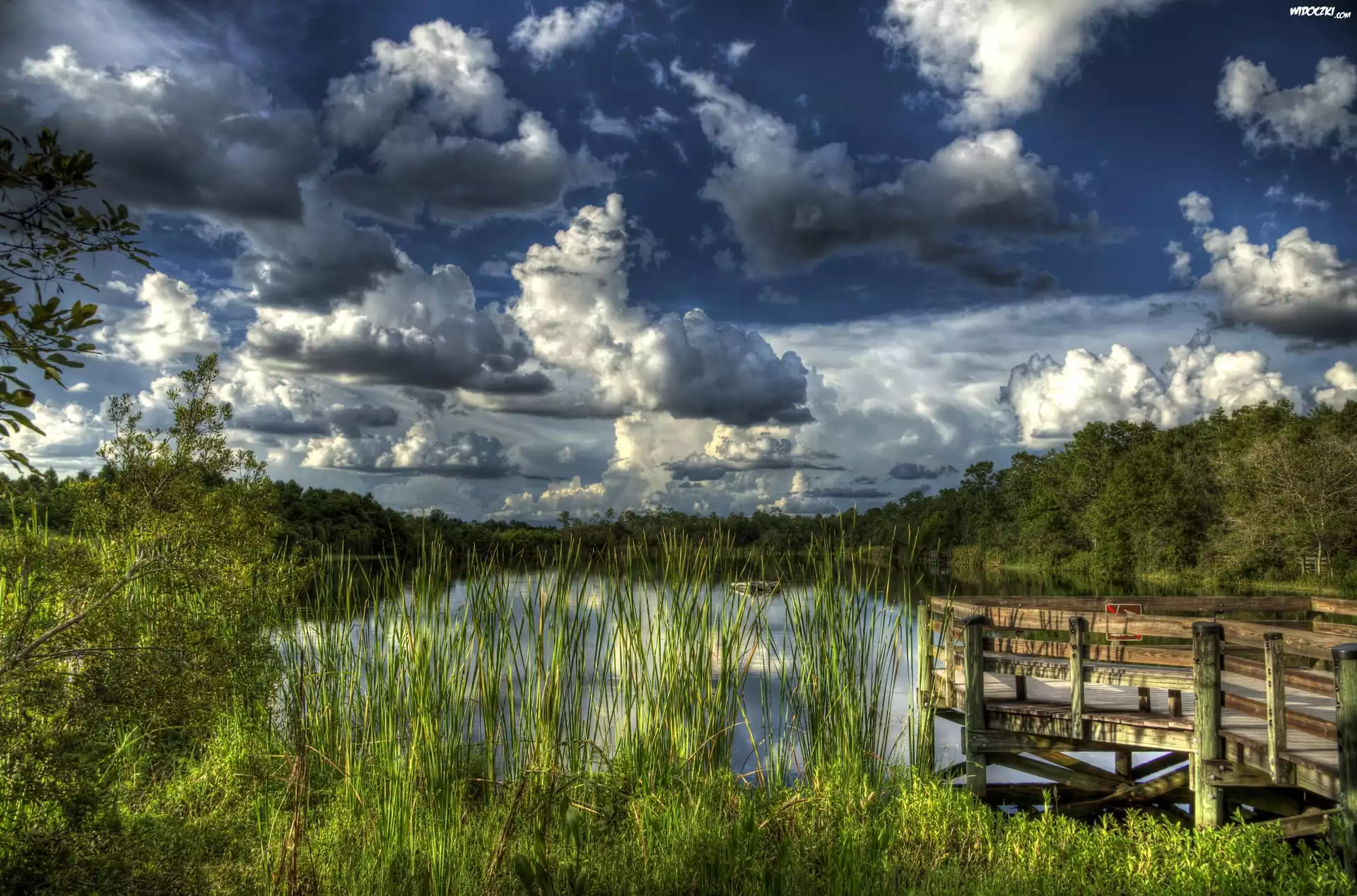 Jezioro, Zachmurzone, Niebo, Pomost, Roślinność, HDR