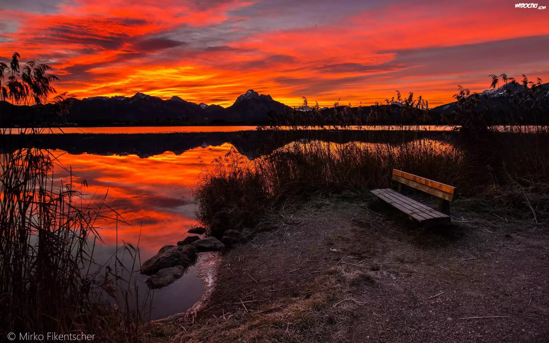 Zdjęcia, Jezioro, Zachód słońca, Ławka, Roślinność, Drzewa