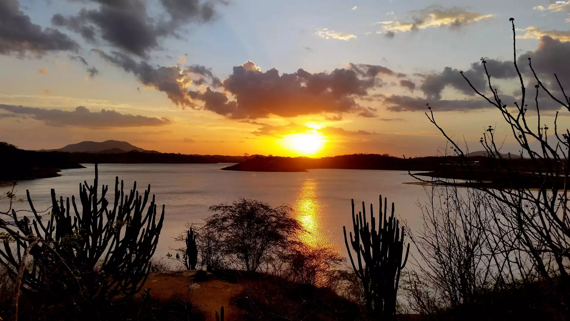 Jezioro, Góry, Zachód słońca, Roślinność, Chmury