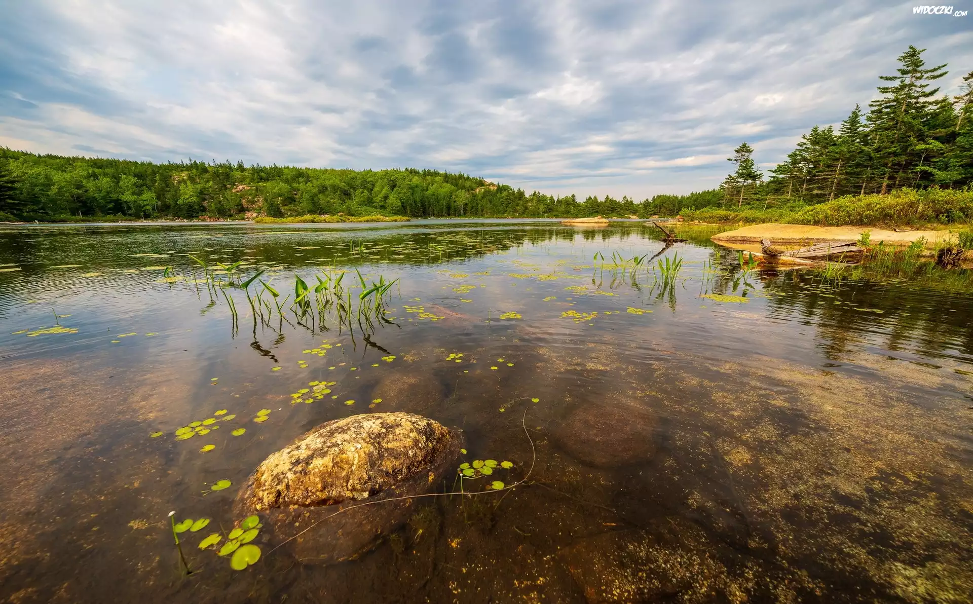 Zdjęcia, Jezioro, Drzewa, Rośliny, Kamień