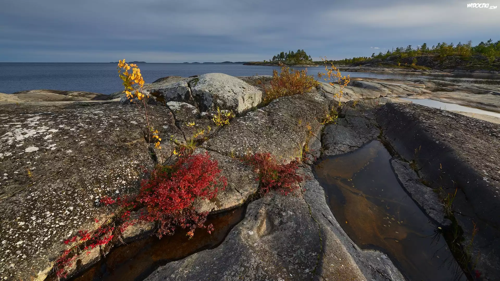 Zdjęcia, Jezioro, Skały, Kamienie, Rośliny, Chmury