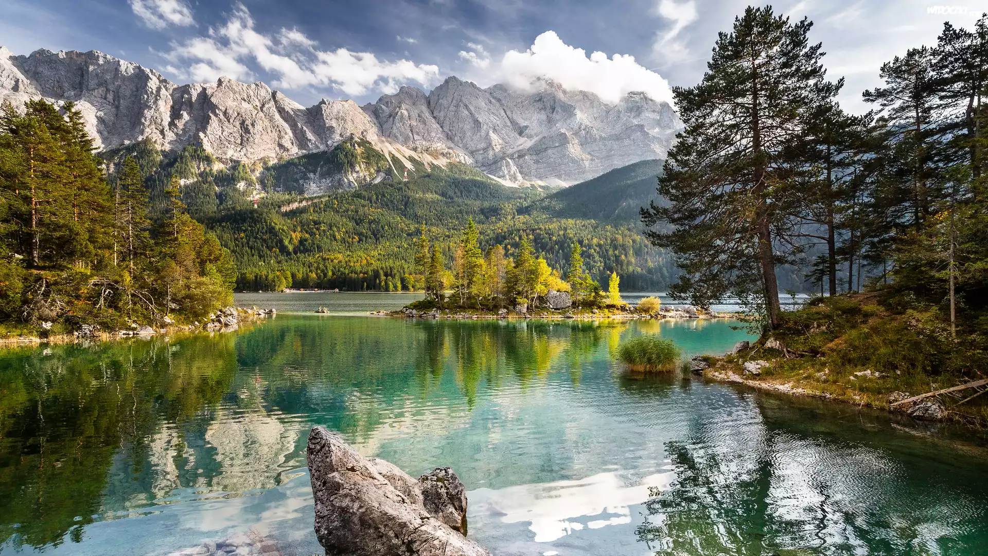 Zdjęcia, Drzewa, Góry, Skała, Jezioro Elbsee, Bawaria, Niemcy