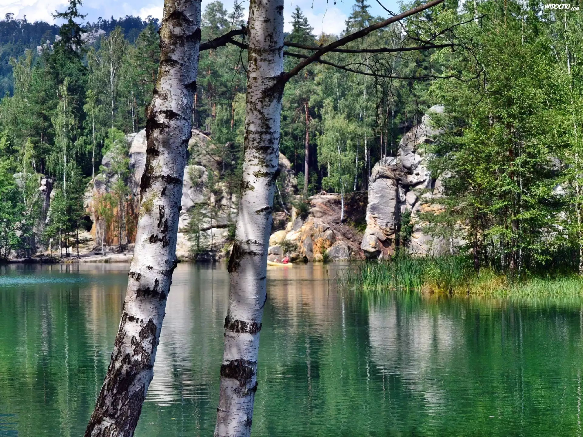 Zdjęcia, Jezioro, Las, Skały, Brzozy