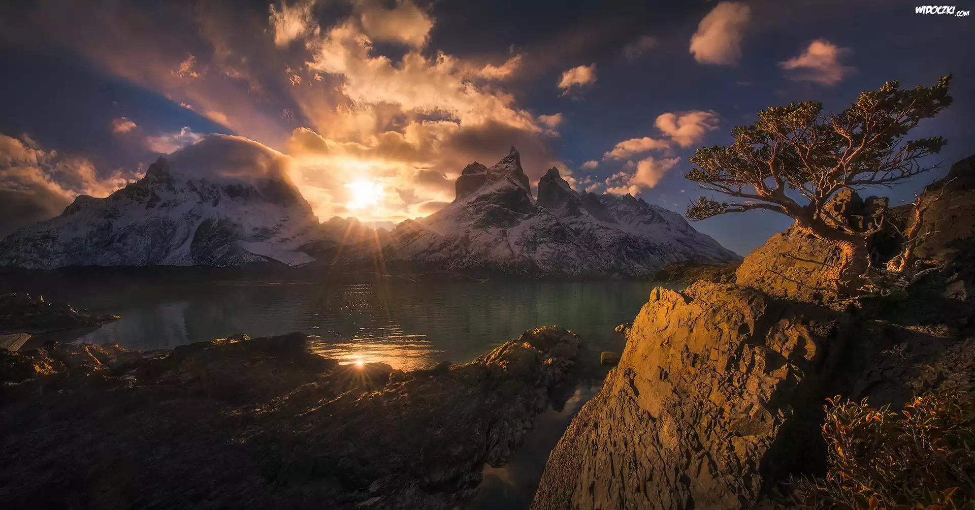 Jezioro, Góry, Promienie, Słońca, Skały, Drzewo