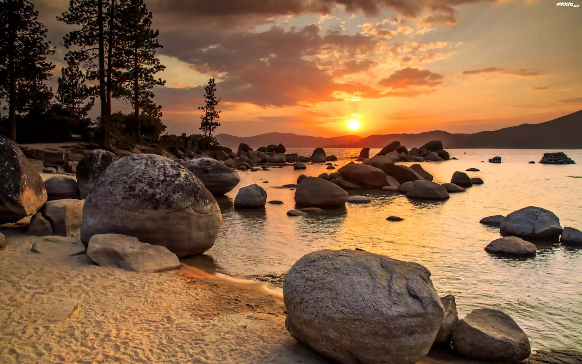 Zdjęcia, Jezioro, Zachód, Słońca, Kamienie, Skały, Plaża