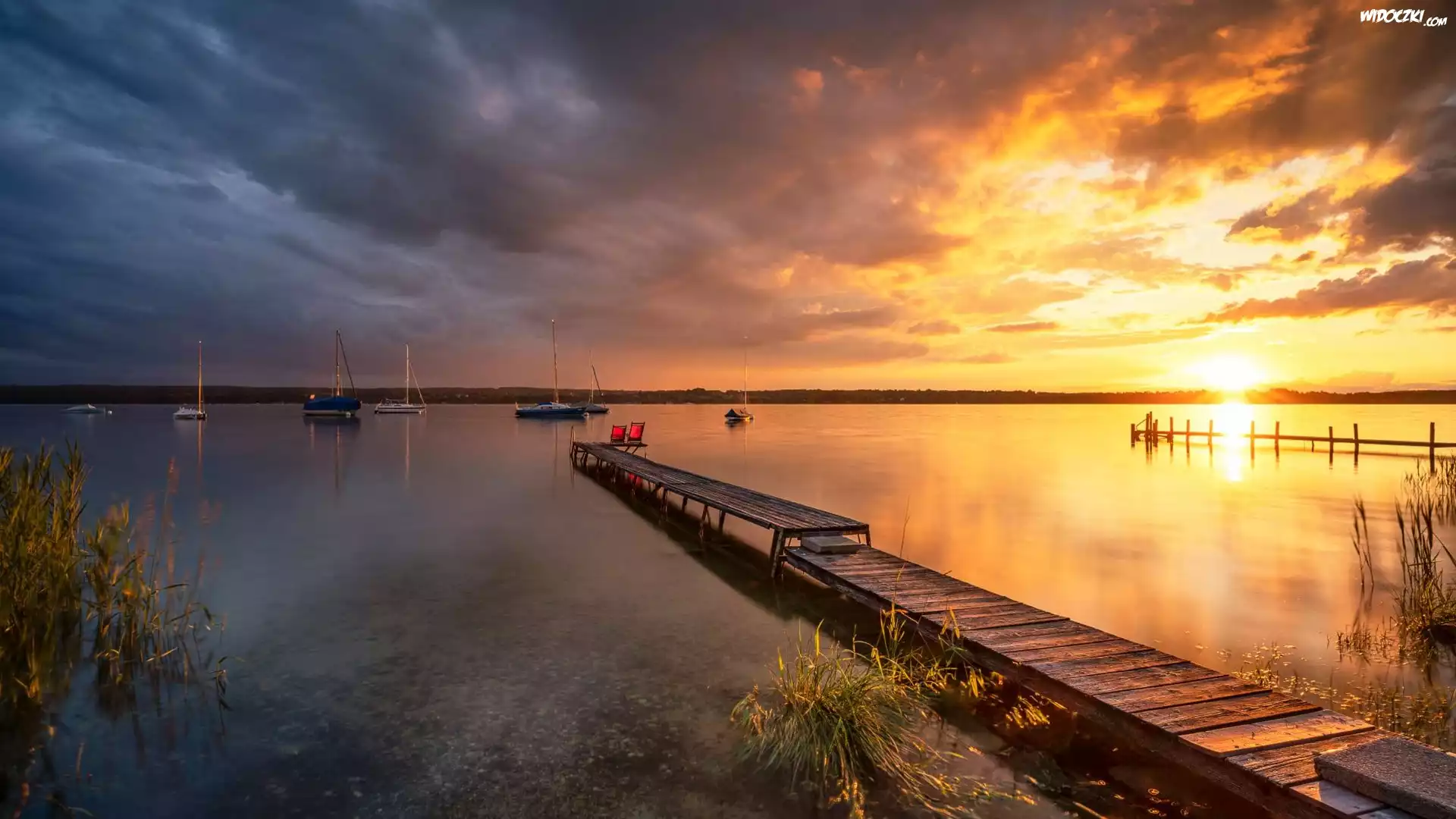 Zdjęcia, Jezioro, Pomost, Żaglówki, Wschód słońca, Chmury