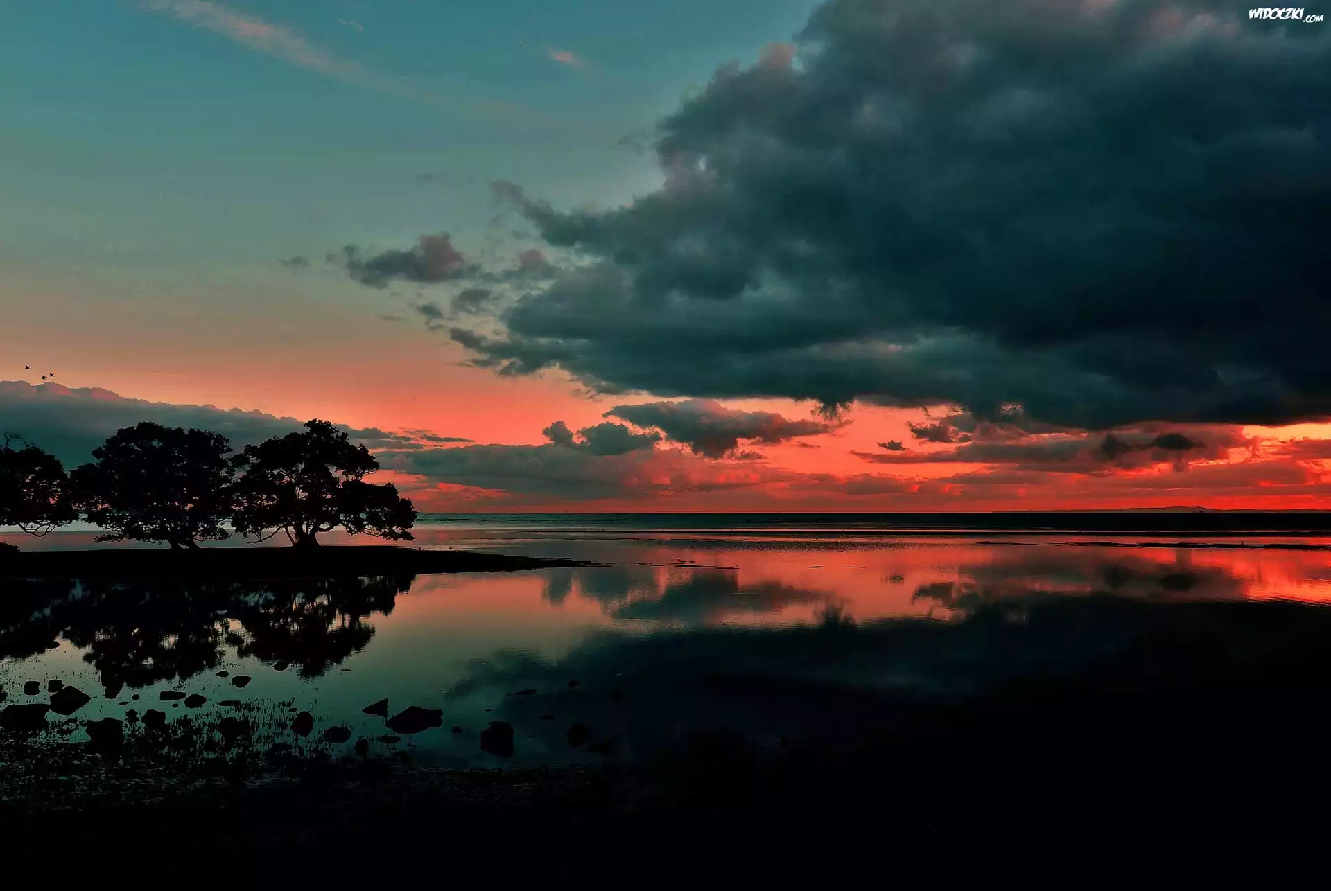 Jezioro, Drzewa, Chmury, Zachód, Słońca, Odbicie