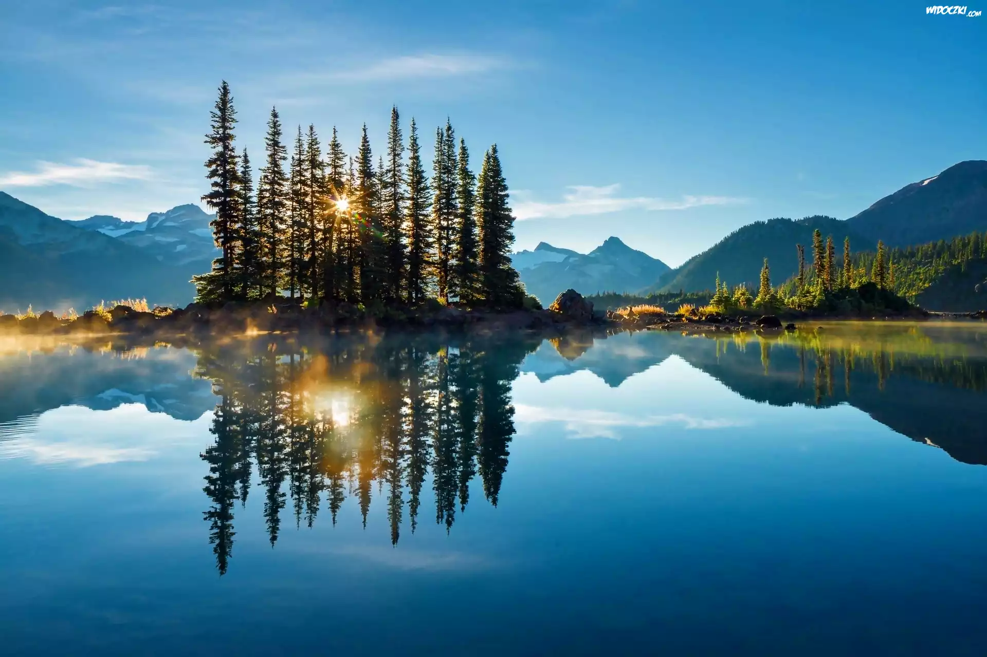 Jezioro, Góry, Drzewa, Wschód Słońca, Mgła