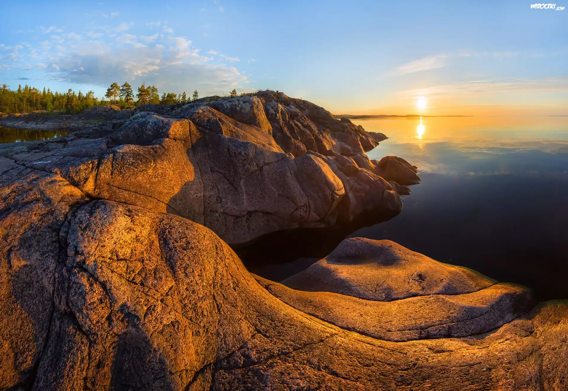 Jezioro, Skały, Drzewa, Wschód słońca, Chmury