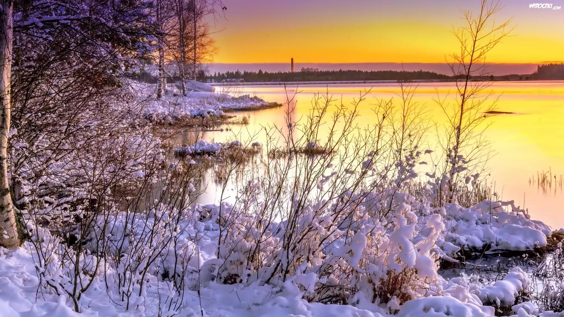 Zdjęcia, Jezioro, Lasy, Drzewa, Zachód, Słońca, Zima