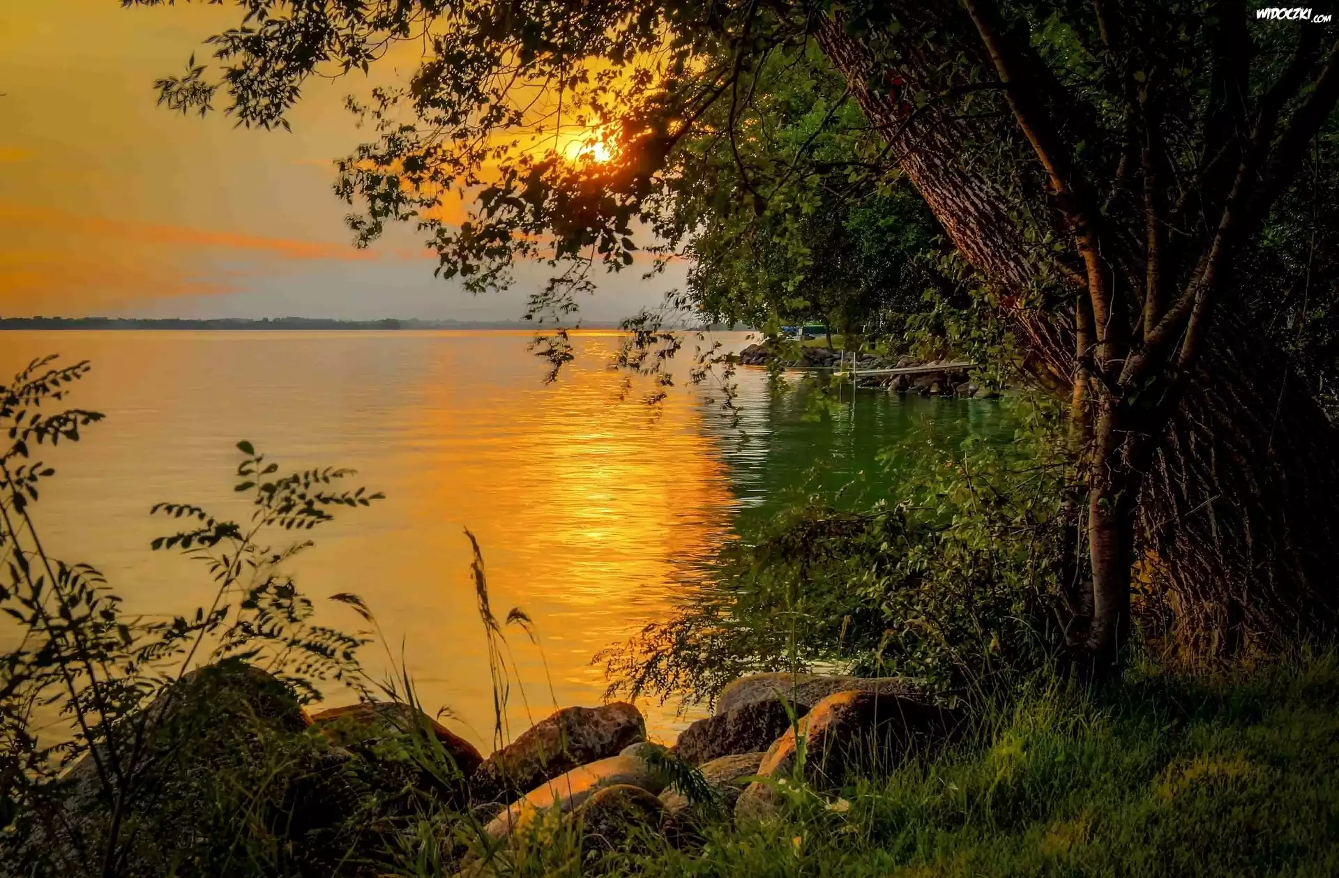 Zdjęcia, Jezioro, Drzewo, Kamienie, Zachód, Słońca, Roślinność