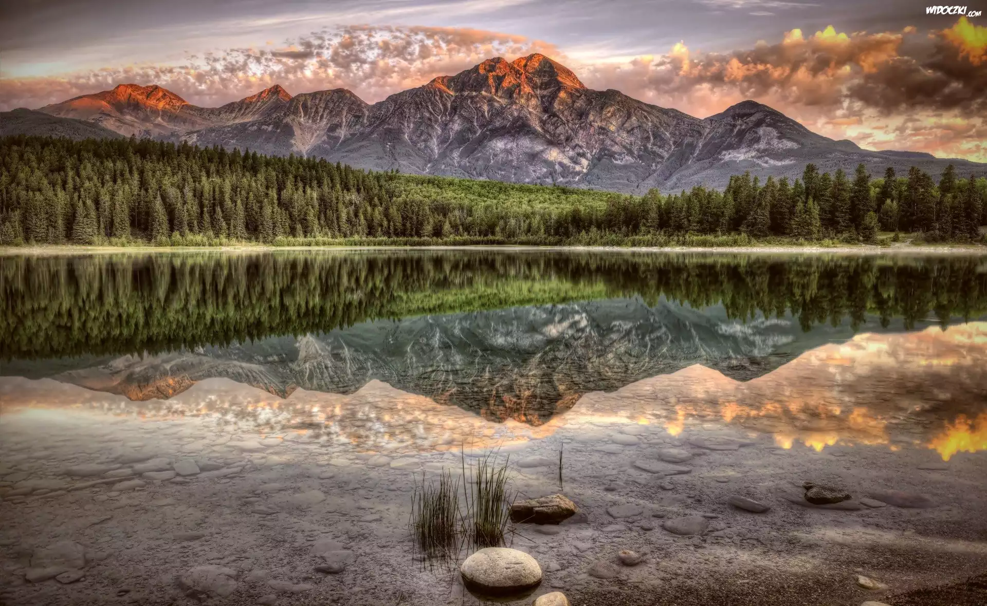 Jezioro, Góry, Lasy, Zachód Słońca, Odbicie