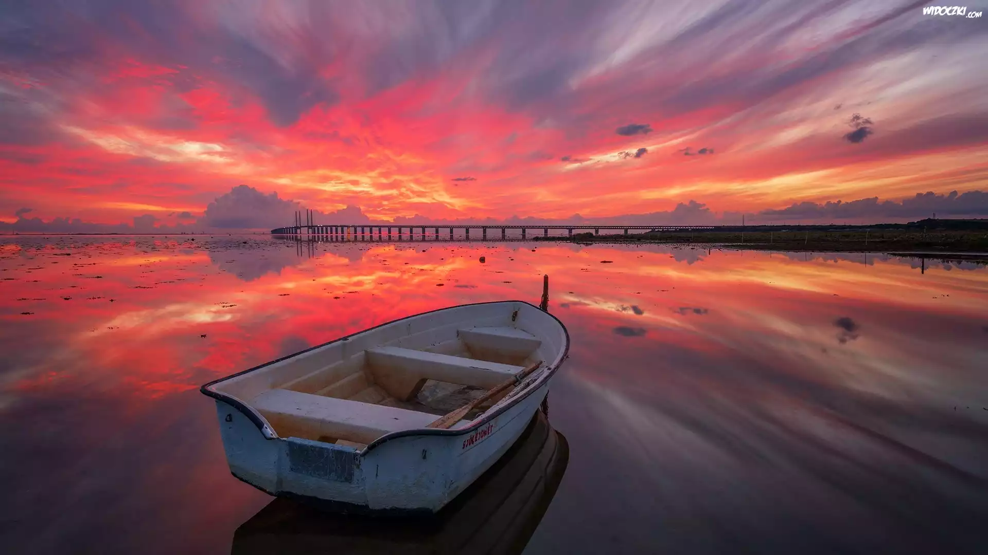 Zdjęcia, Jezioro, Most, Łódka, Zachód słońca, Chmury