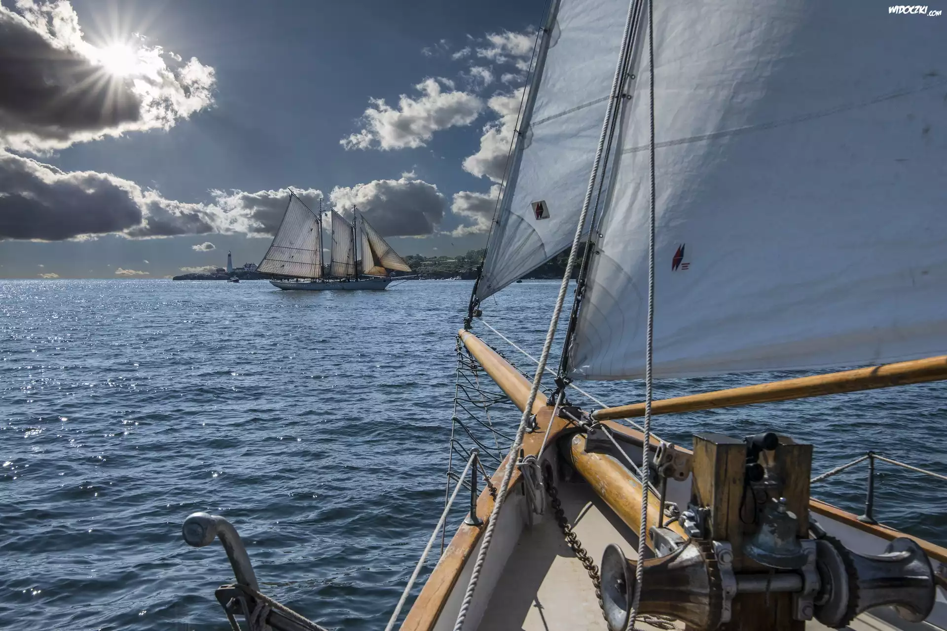 Jezioro, Chmury, Promienie, Słońca, Żaglówki