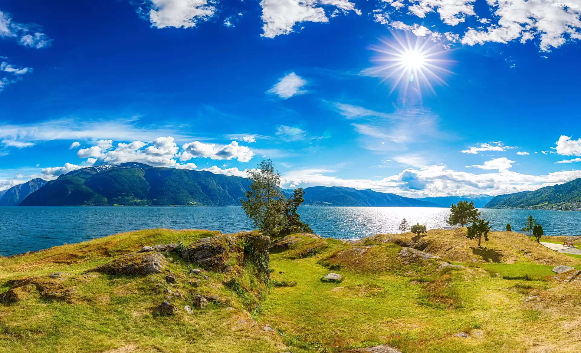 Zdjęcia, Jezioro, Góry, Promienie słońca, Chmury
