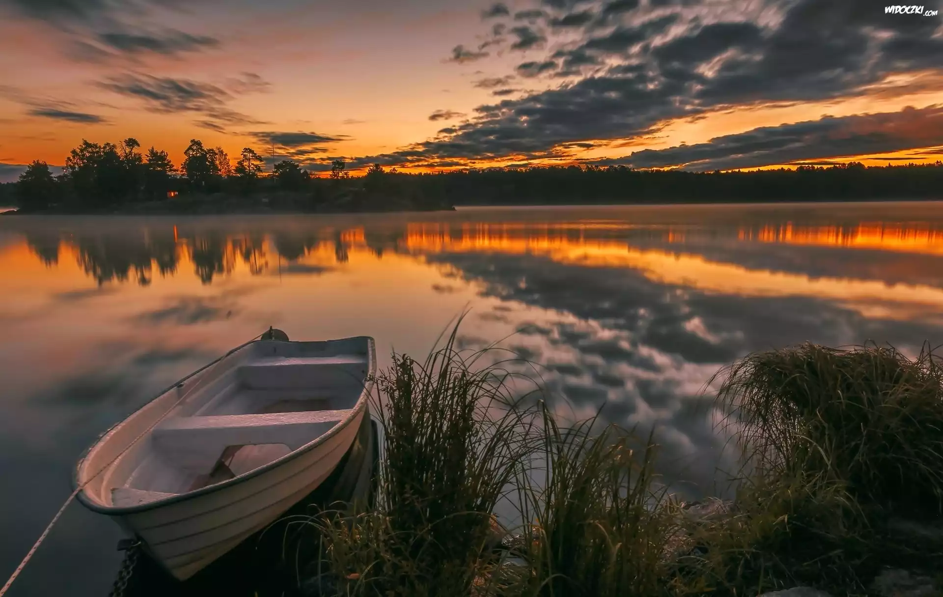 Jezioro, Łódka, Trawa, Zachód, Słońca, Chmury