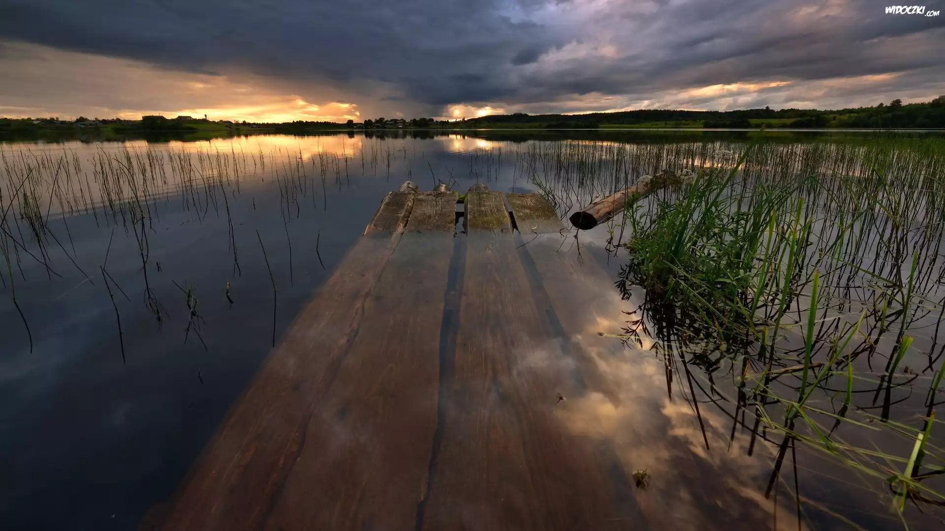 Zdjęcia, Jezioro, Pomost, Trawy, Zachód słońca, Chmury