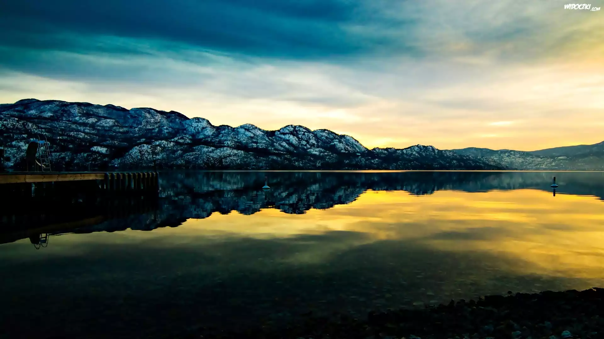 Jezioro, Góry, Wschód Słońca, Odbicie