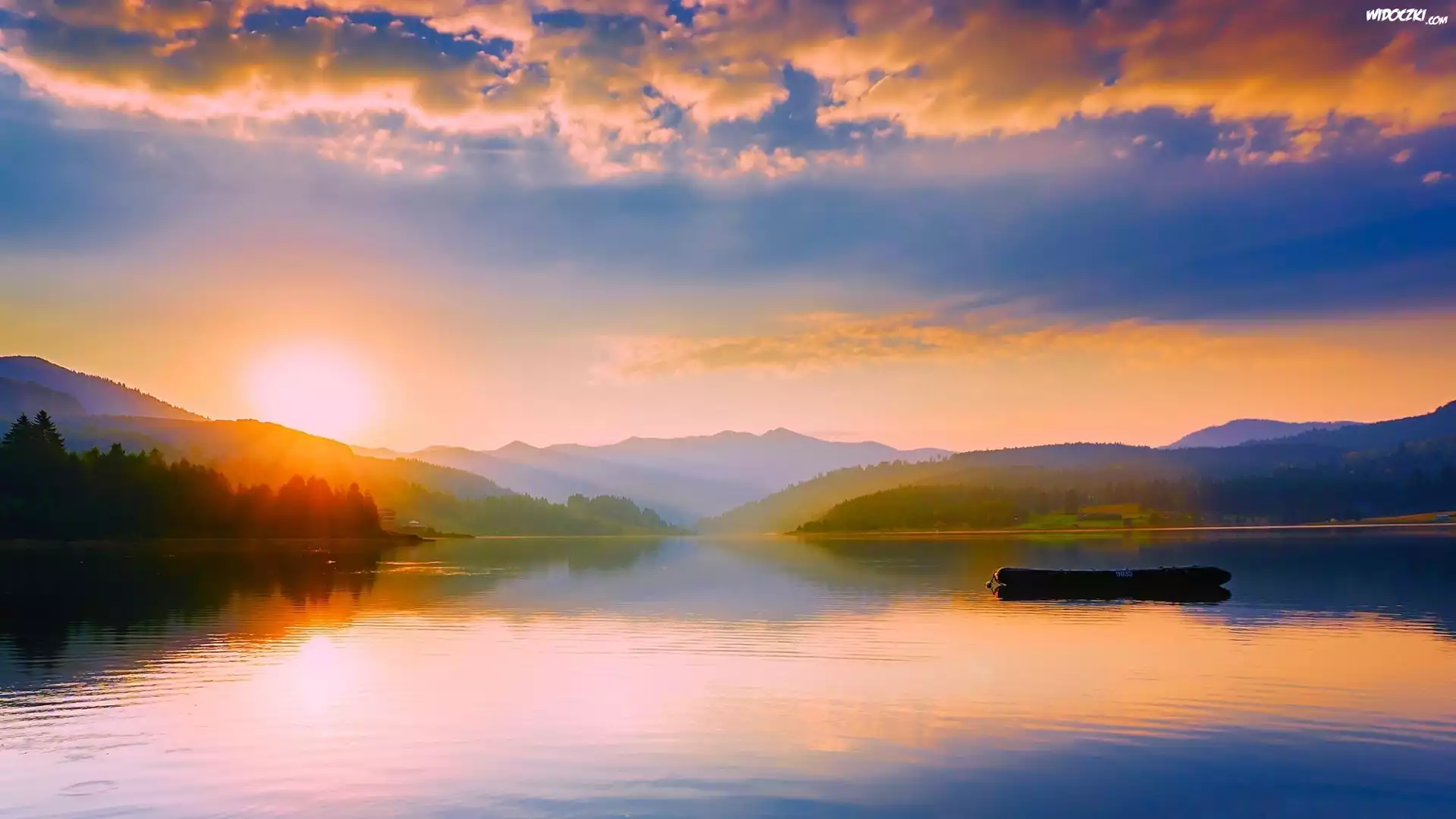 Jezioro, Wschód słońca, Góry