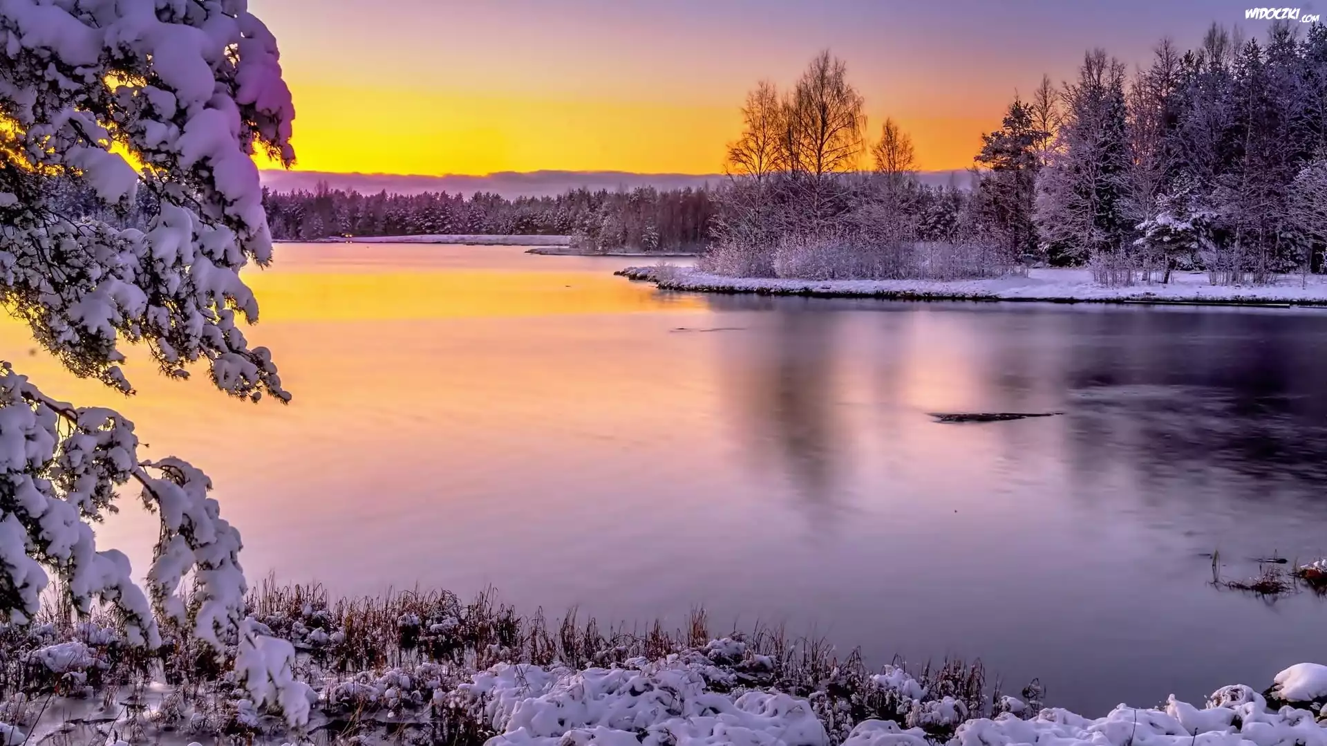 Zdjęcia, Jezioro, Lasy, Wschód, Słońca, Zima