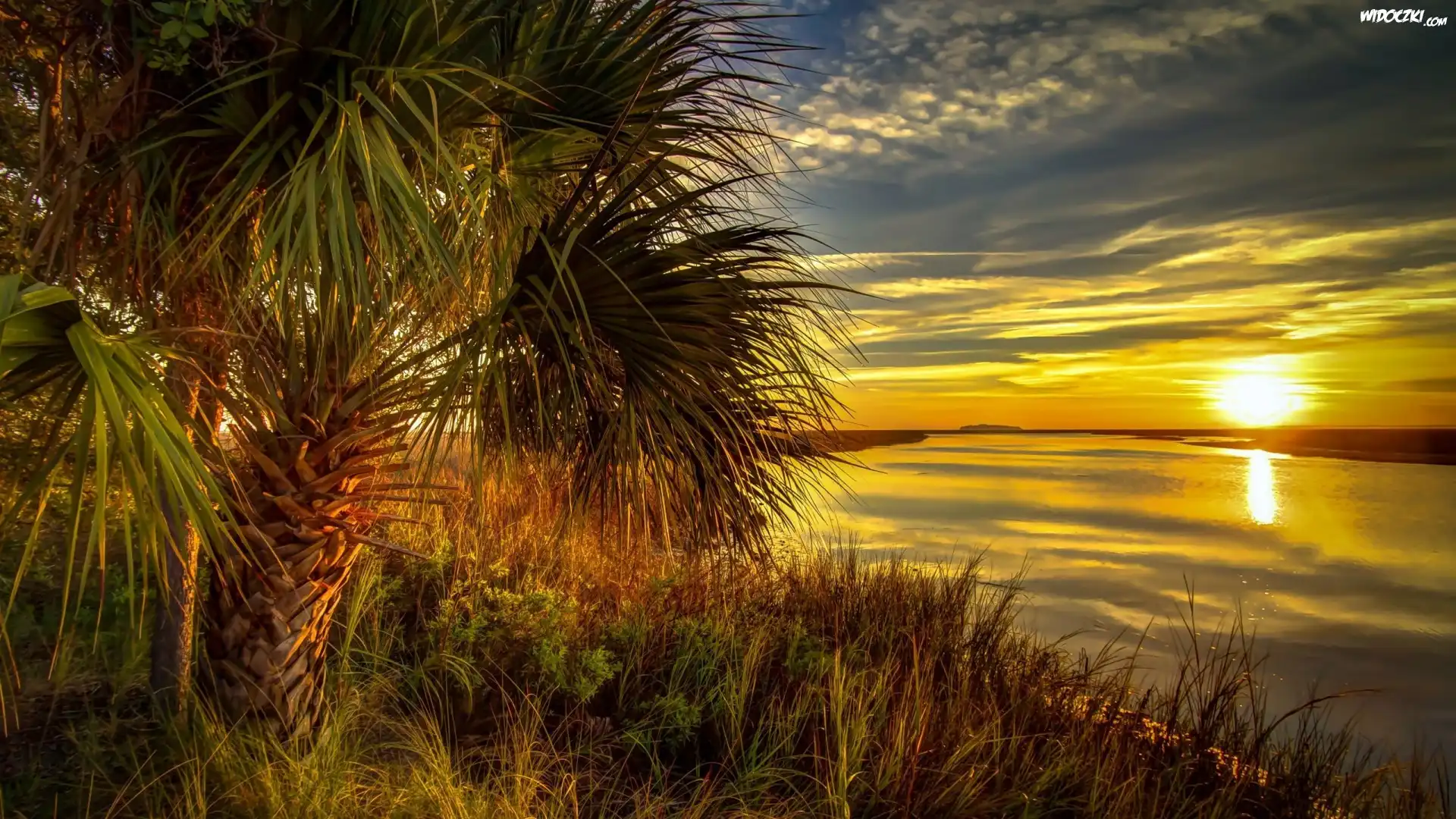 Jezioro, Palma, Wschód Słońca, Trawa