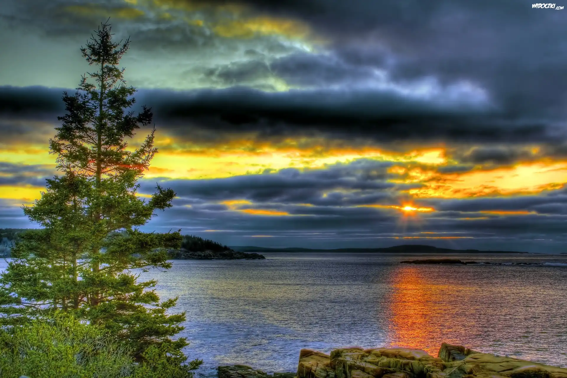 Zdjęcia, Jezioro, Chmury, Zachód Słońca, Drzewo