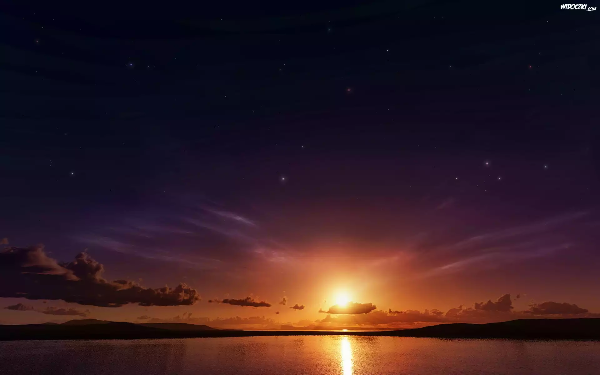 Jezioro, Chmury, Zachód, Słońca, Gwiazdy
