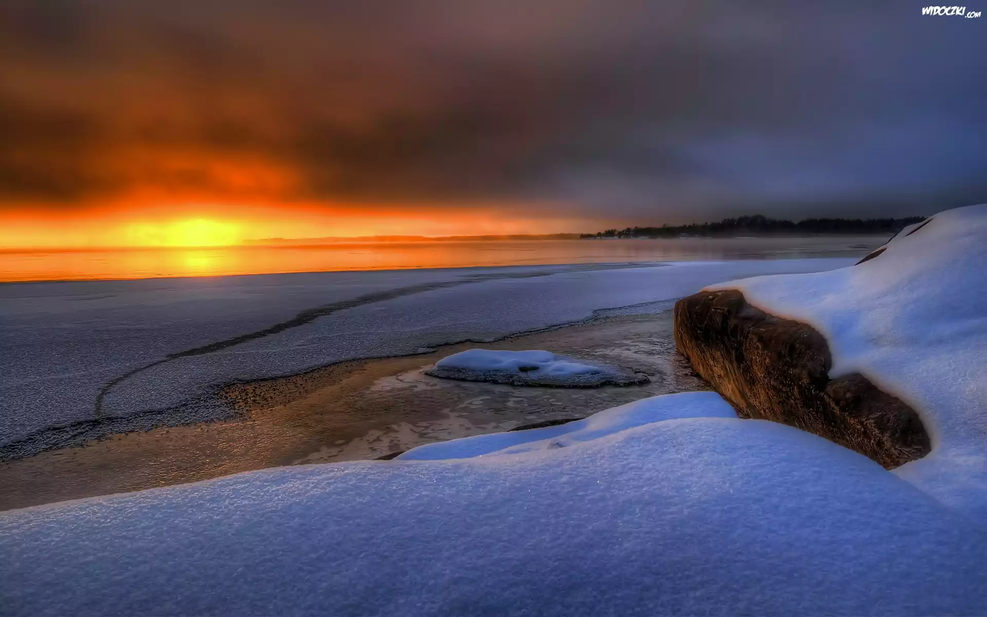 Jezioro, Chmury, Zachód, Słońca, Śnieg