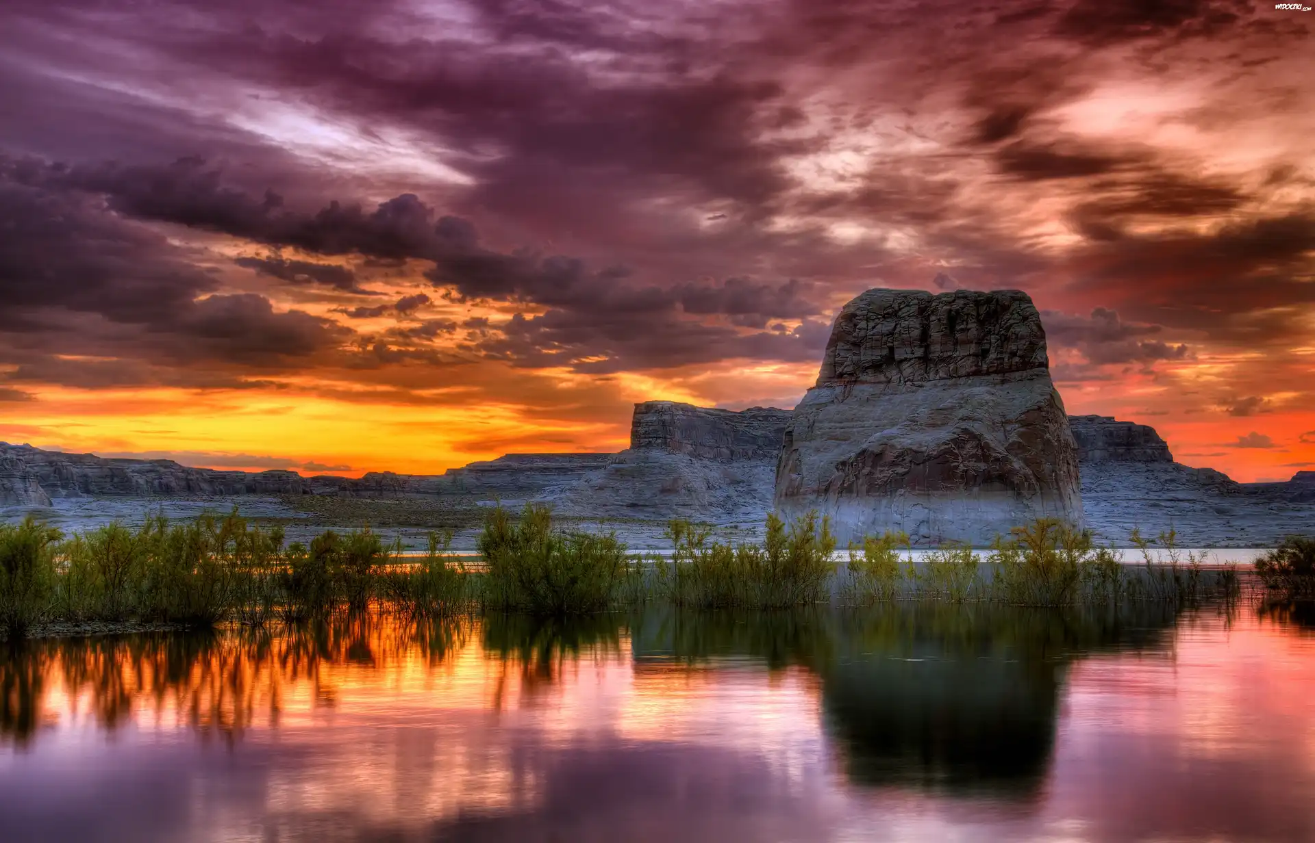 Jezioro, Chmury, Zachód, Słońca, Skały