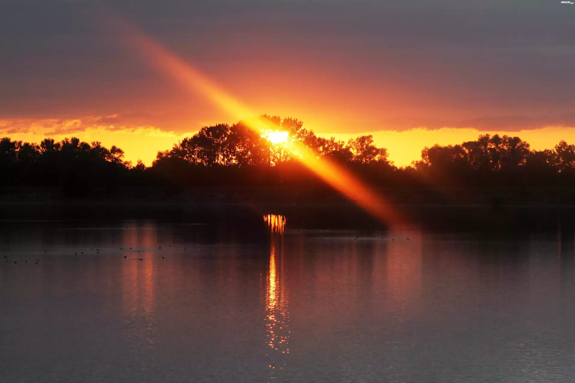 Jezioro, Zachód słońca, Drzewa