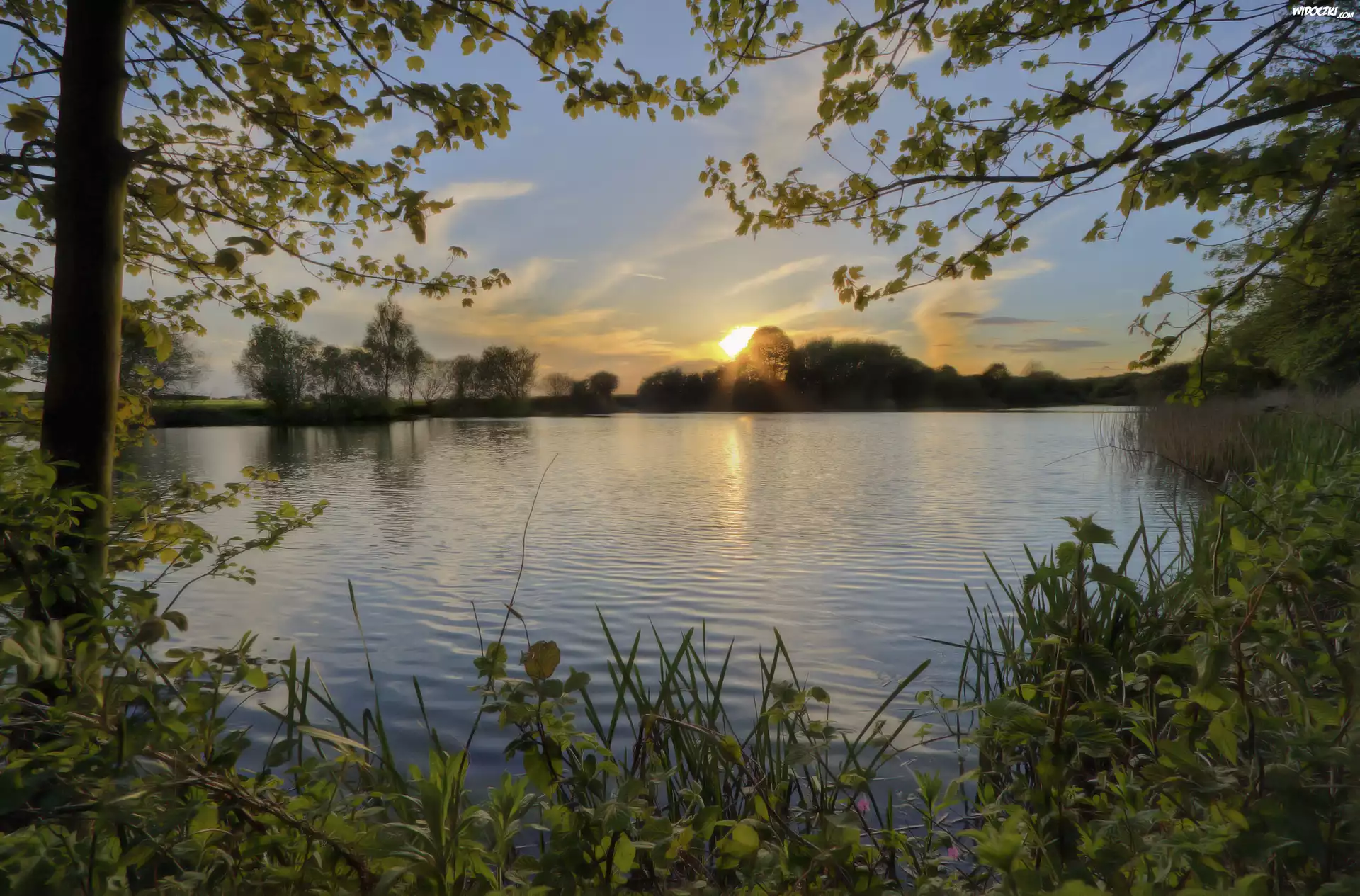 Jezioro, Zachód, Słońca, Drzewa