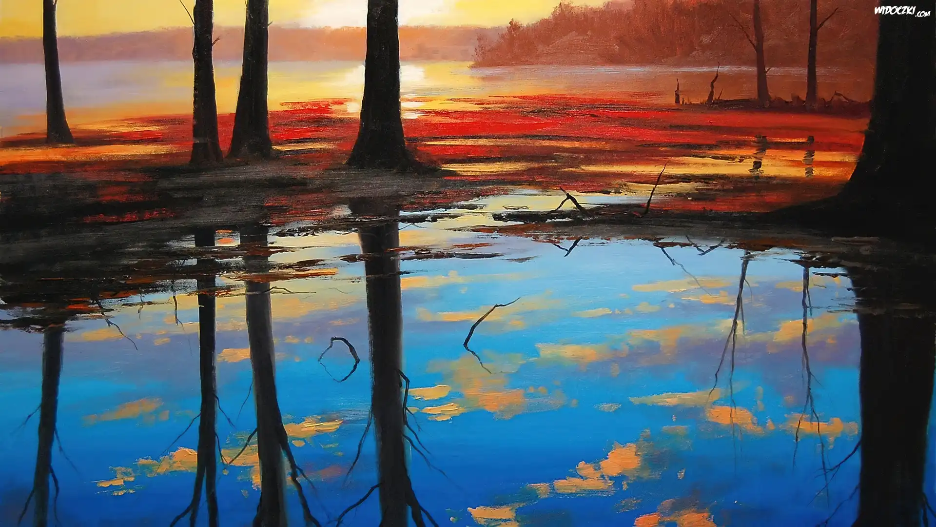 Zdjęcia, Jezioro, Zachód, Słońca, Drzewa