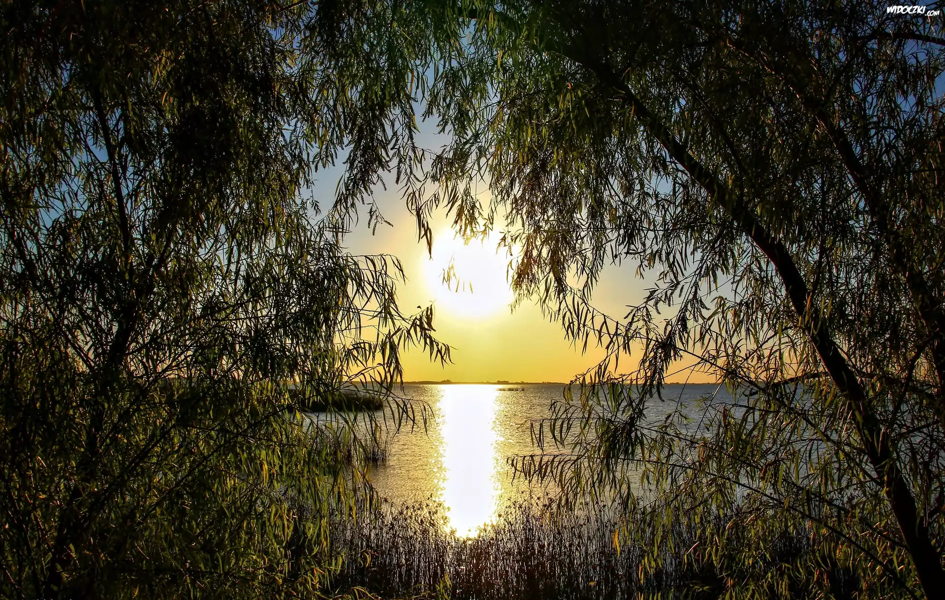 Zdjęcia, Jezioro, Zachód Słońca, Drzewa