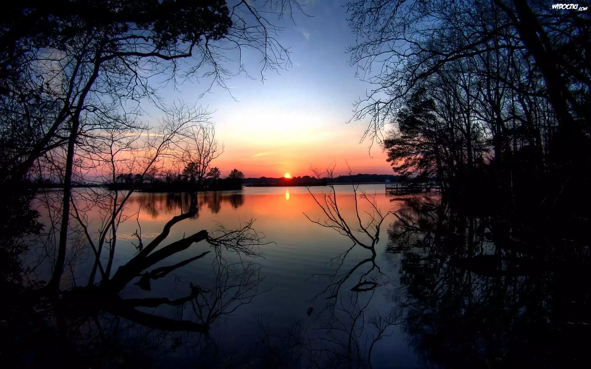 Zdjęcia, Jezioro, Zachód, Słońca, Drzewa