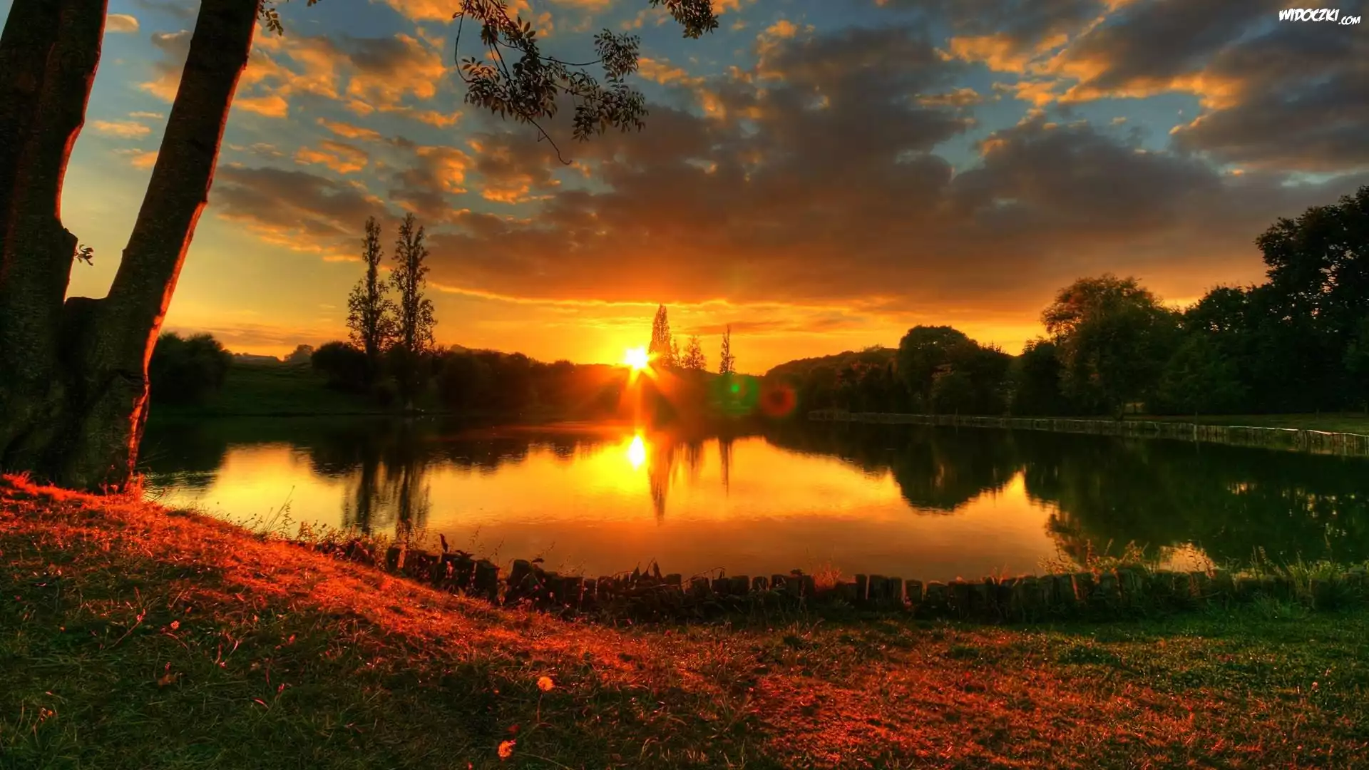 Zdjęcia, Jezioro, Zachód, Słońca, Drzewa