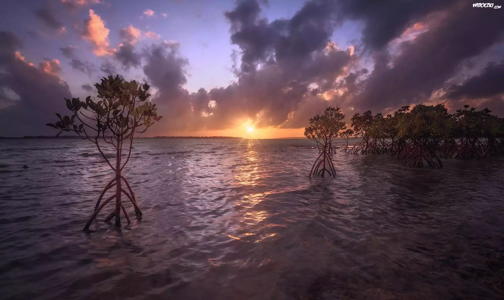 Jezioro, Drzewa, Zachód słońca, Chmury