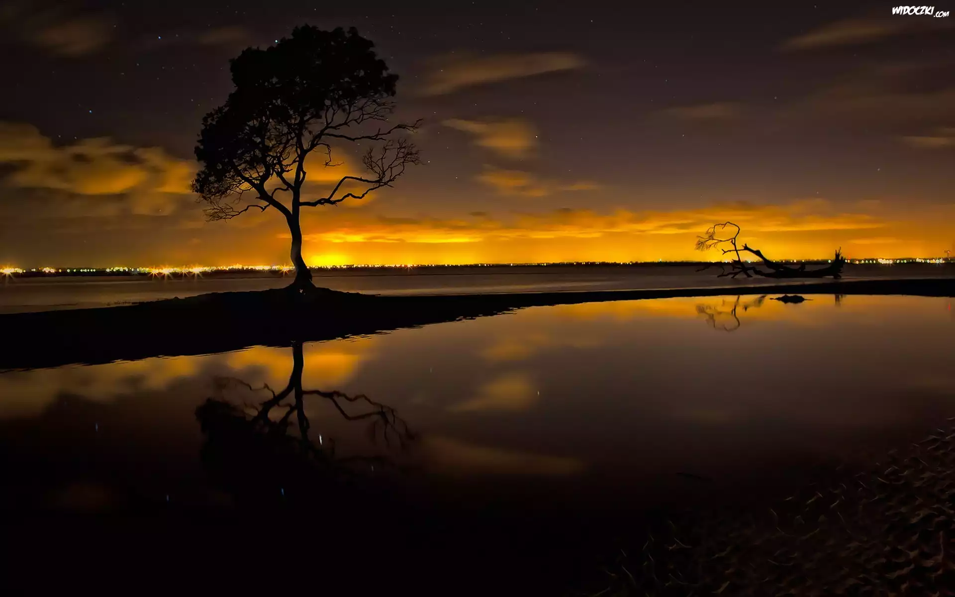 Zdjęcia, Jezioro, Zachód, Słońca, Drzewo