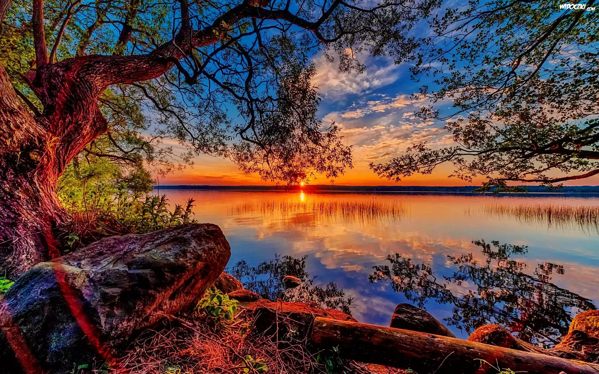 Zdjęcia, Jezioro, Zachód, Słońca, Drzewo
