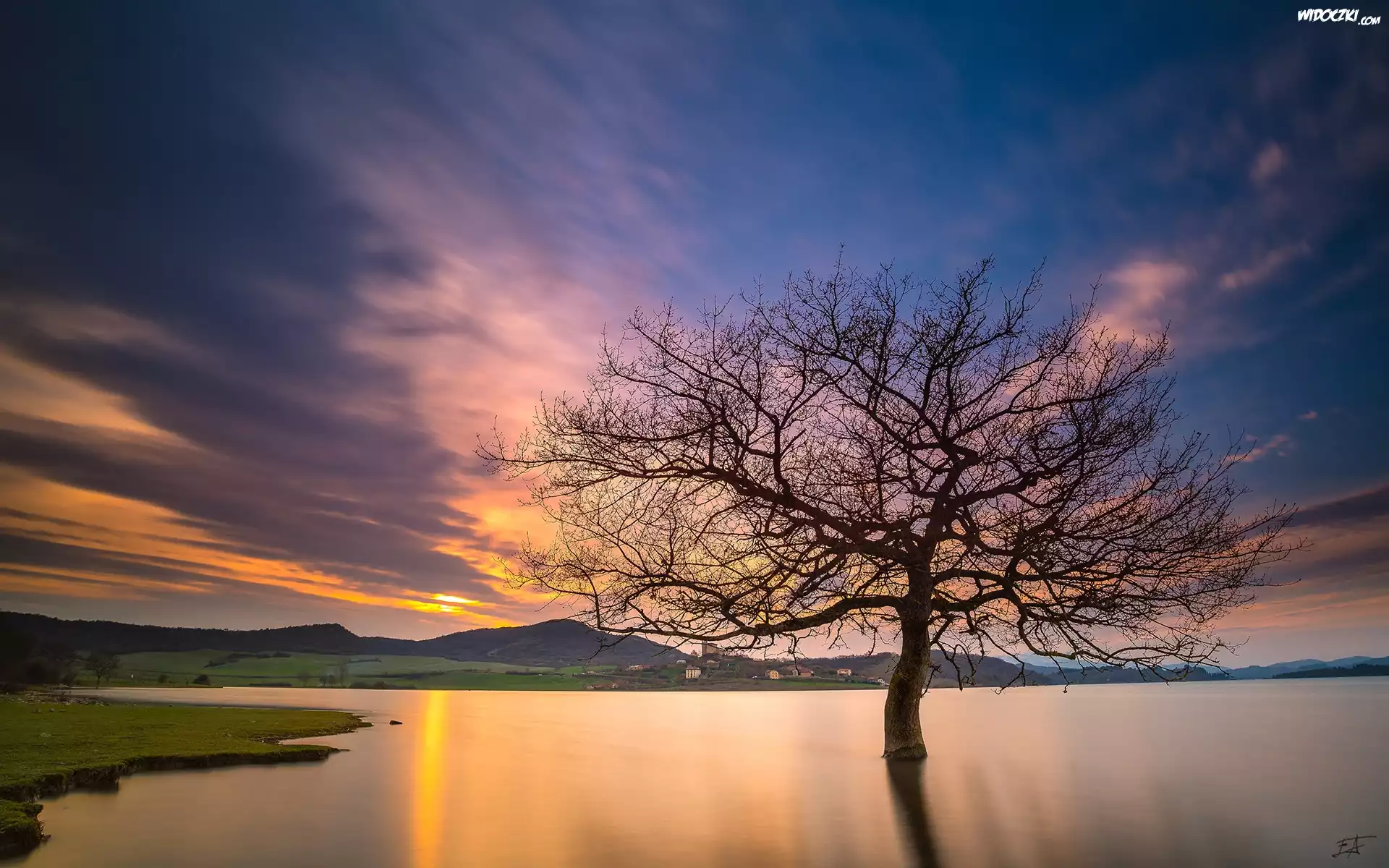 Zdjęcia, Jezioro, Góry, Zachód słońca, Drzewo