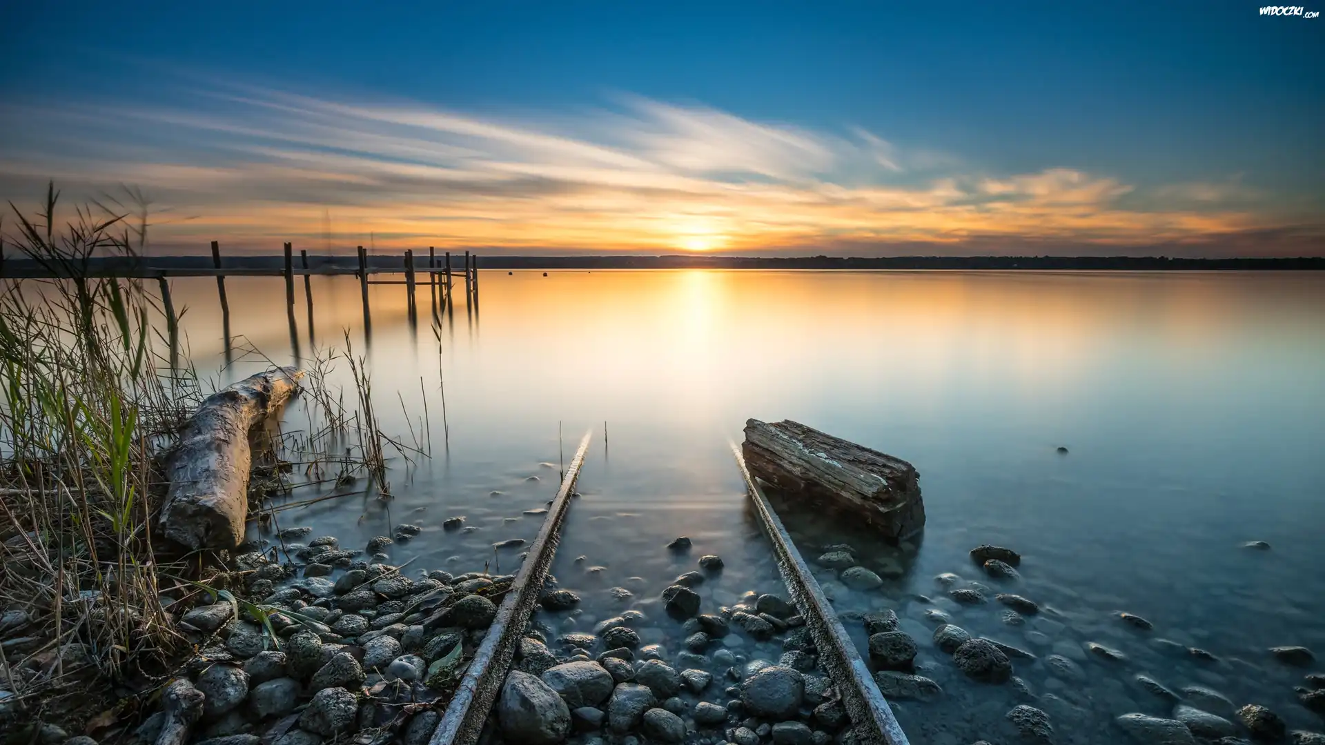 Zdjęcia, Jezioro, Kamienie, Zachód słońca, Pomost