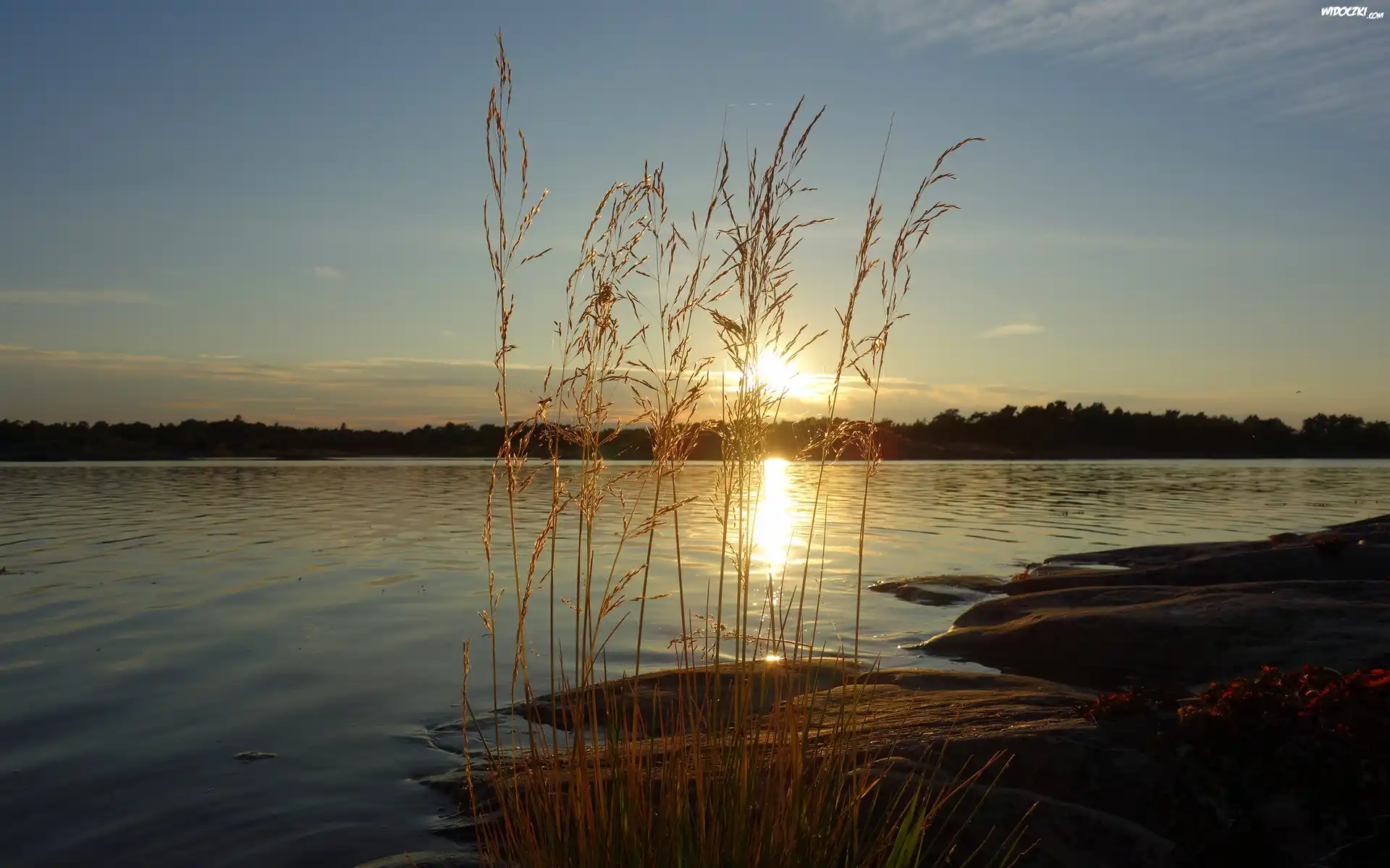 Jezioro, Las, Zachód słońca, Roślinność