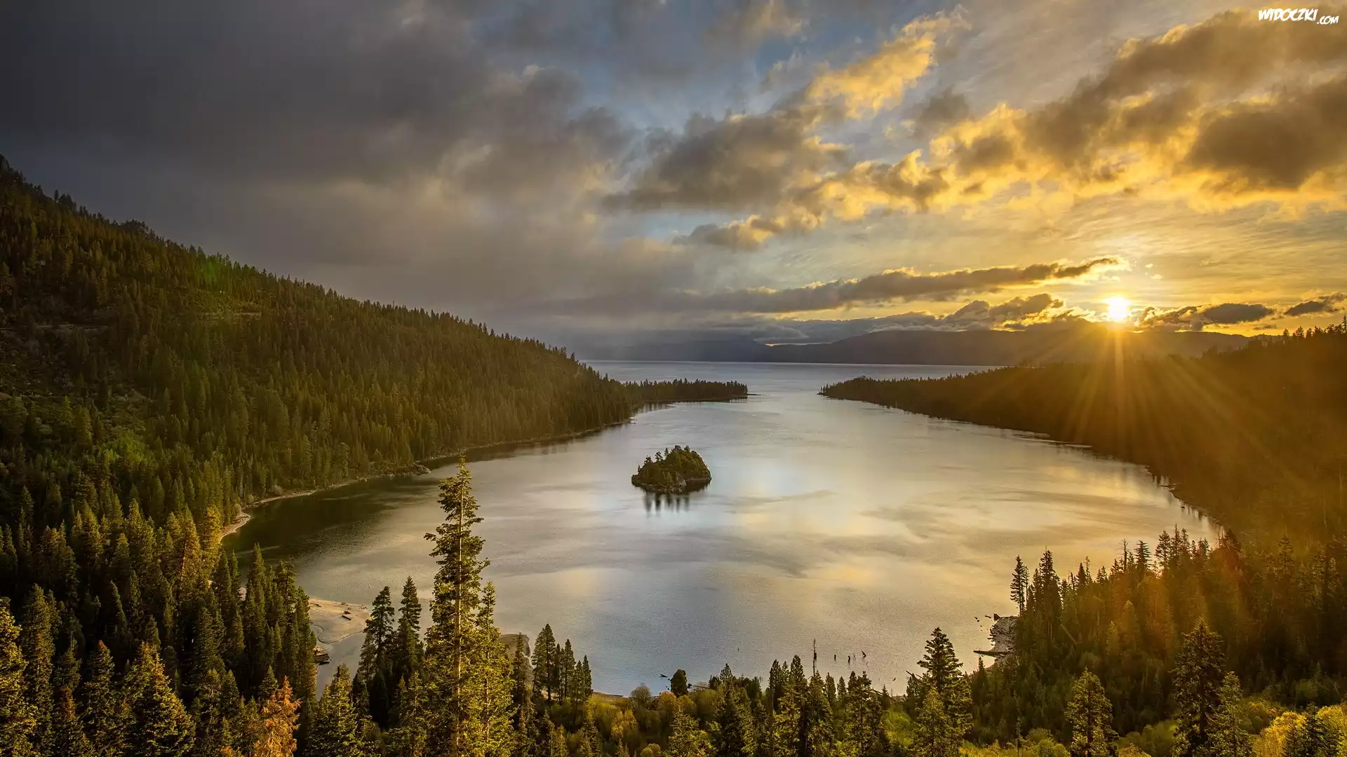 Zdjęcia, Jezioro, Las, Zachód Słońca, Wyspa