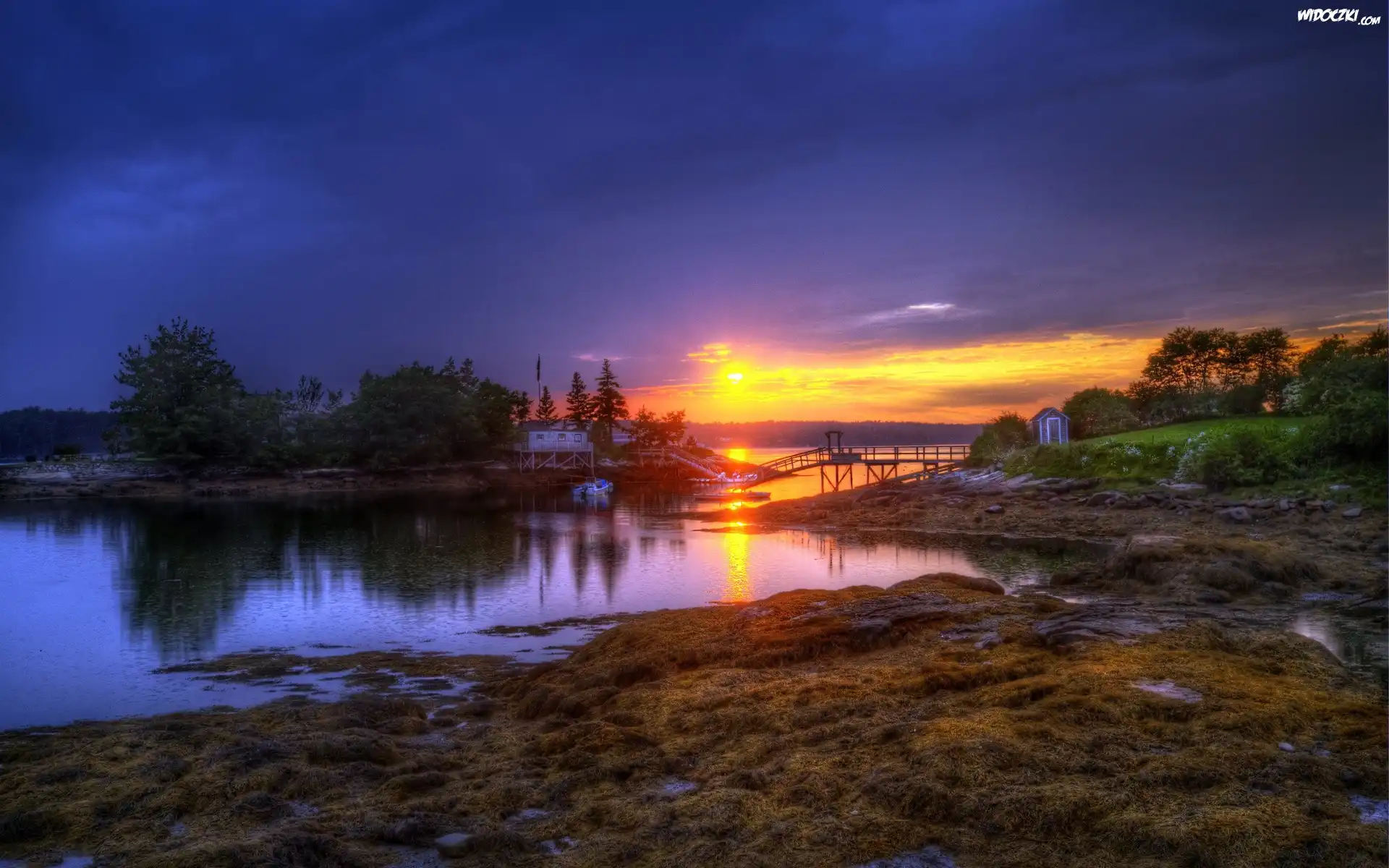 Zdjęcia, Jezioro, Zachód, Słońca, Most
