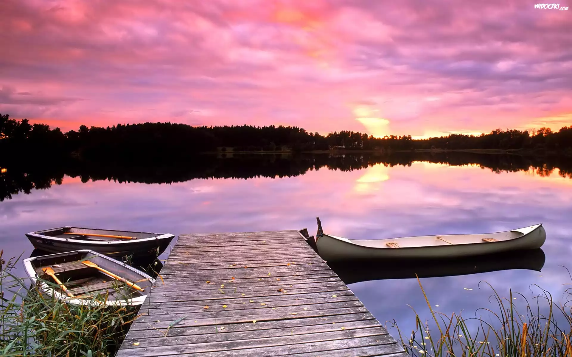 Zdjęcia, Jezioro, Zachód, Słońca, Łódki