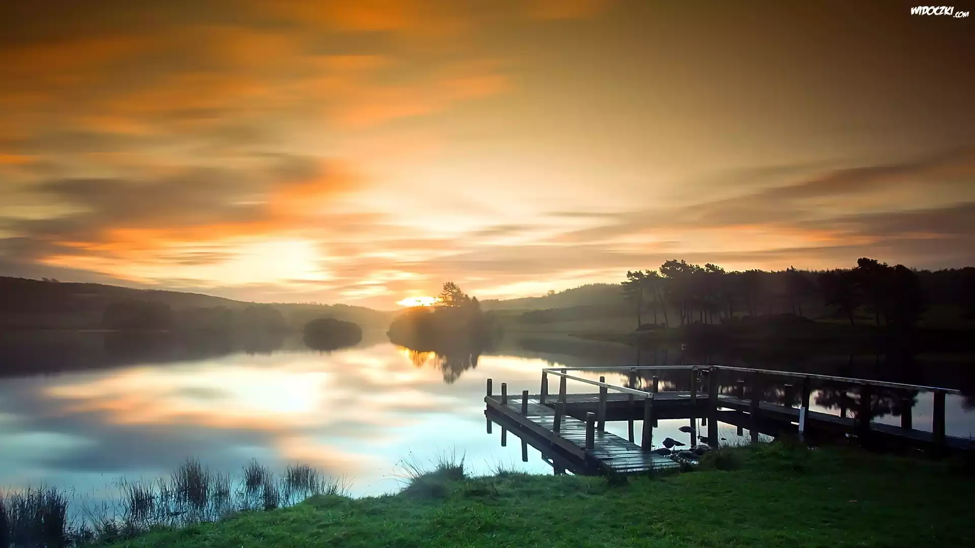 Zdjęcia, Jezioro, Pomost, Zachód, Słońca, Mgła