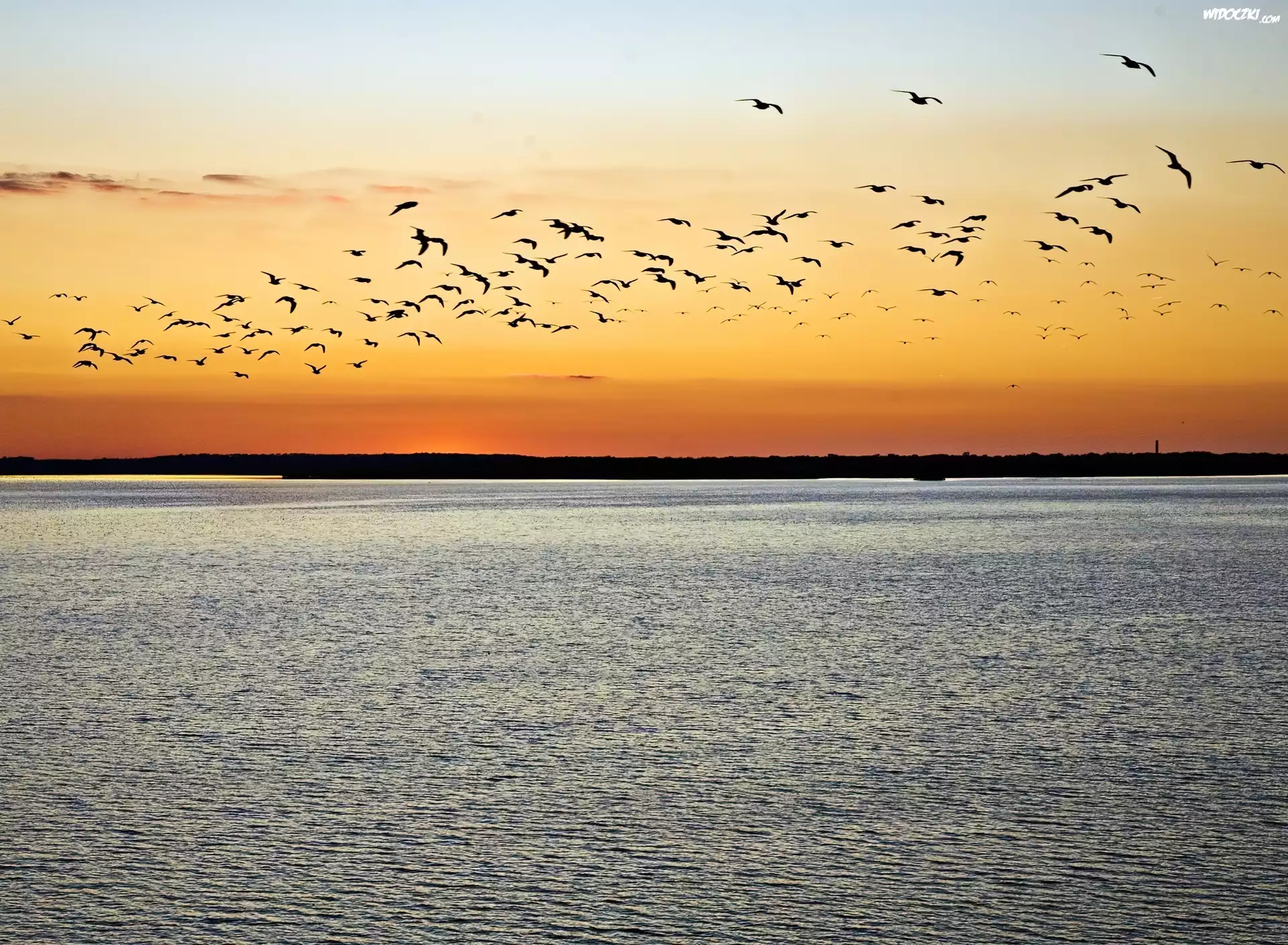 Zdjęcia, Jezioro, Ptaki, Zachód Słońca, Niebo