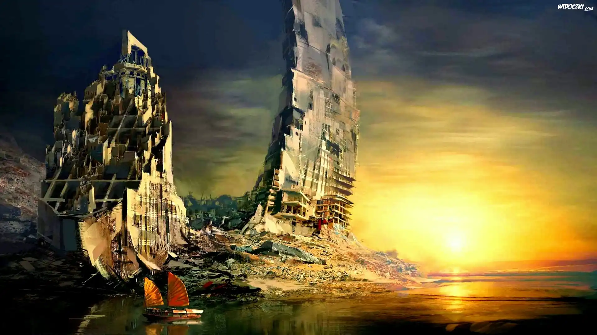 Zdjęcia, Jezioro, Zachód, Słońca, Ruiny