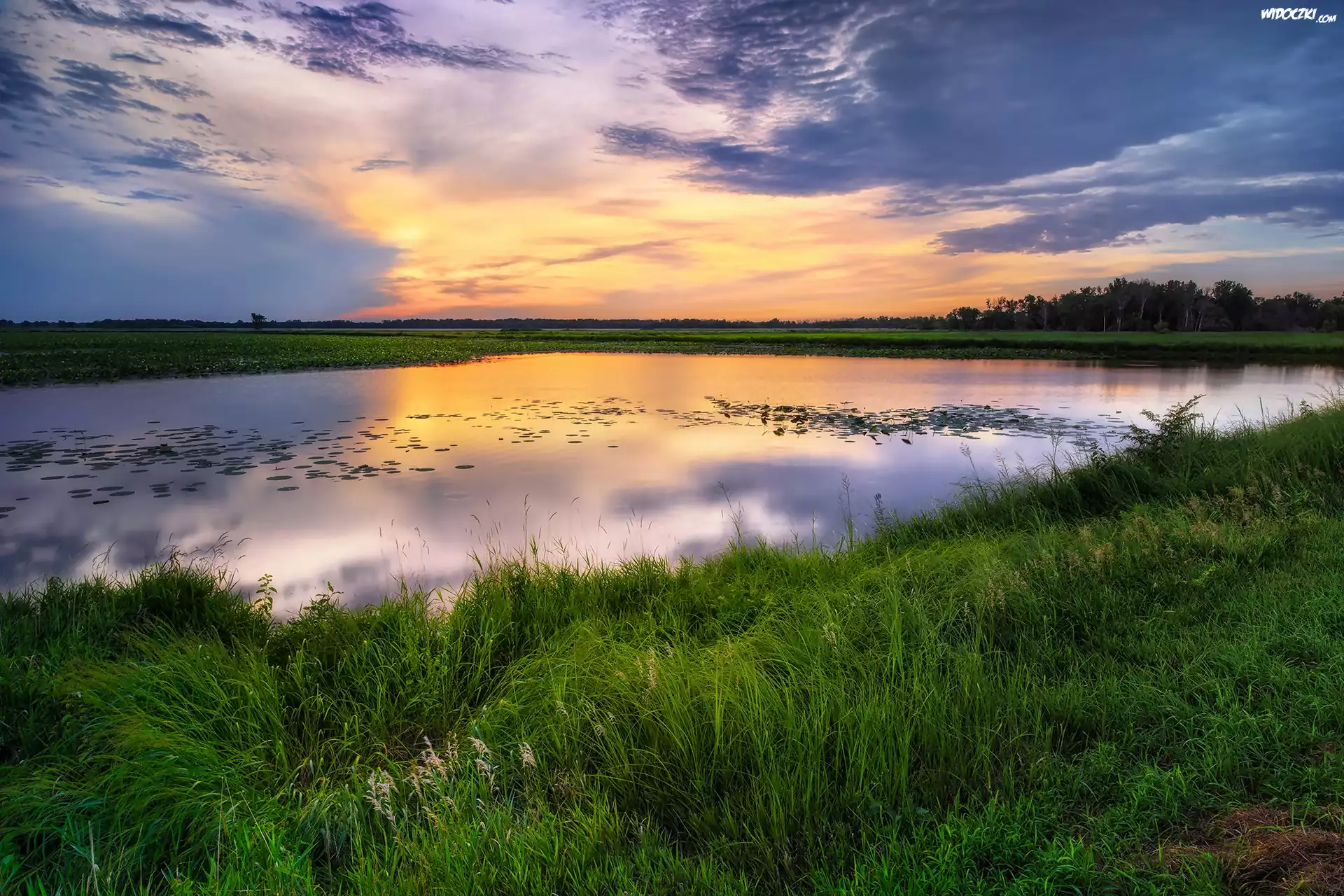 Zdjęcia, Jezioro, Zachód słońca, Trawa